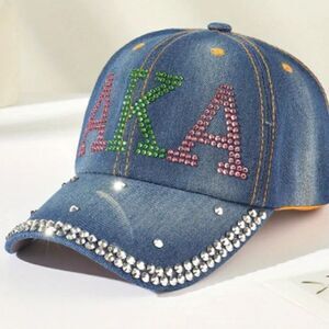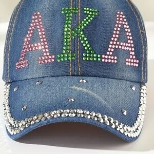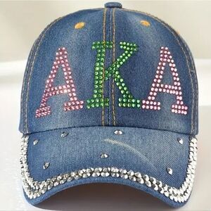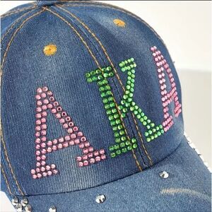 Trending graphic AKA baseball cap complete with bling, rhinestones, and all. Adjustable back.