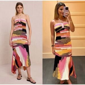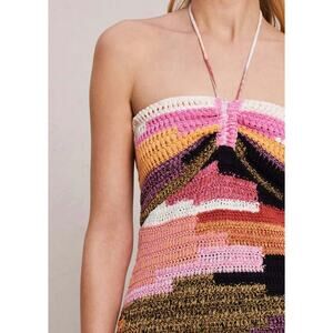This stunning A.L.C. crochet midi dress captures a vibrant, retro-meets-modern energy with its bold hand-knit patchwork design. The fitted halter silhouette and asymmetrical hem make it perfect for summer parties, beach weddings, or resort getaways. Style it with strappy sandals and minimal gold jewelry for an effortless coastal-chic look. A statement piece that channels 2000s crochet revival and 90s bohemian charm — timeless yet on trend.