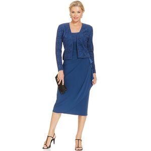 New! ALEX EVENINGS Women's Glittered Lace 2-Piece Jacket & Dress Size 8 Blue