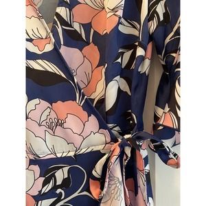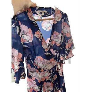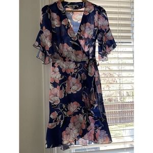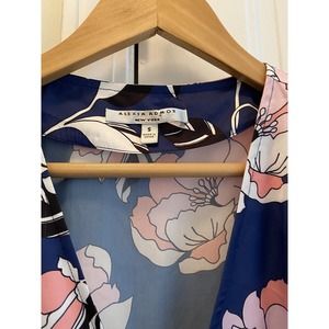 New ALEXIA ADMOR Floral Satin Wrap Dress Blue Pink Size Small Short Bell Sleeve