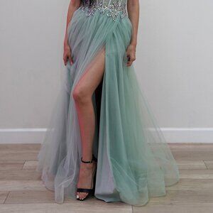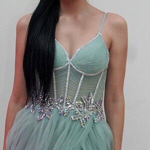 Radiating a soft, ethereal glow, this A-line gown enchants with its layered mesh skirt and shimmering rhinestone accents. The V-neckline and sheer boned bodice sculpt a graceful silhouette, while the lace-up back adds a romantic finishing touch. Ideal for those who embody timeless elegance with a modern edge.