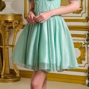 Dazzling and romantic, this Short Glitter Netting A-Line Dress is designed to sparkle with every step. Featuring a soft sweetheart neckline and elegant off-shoulder sleeves, it flatters the neckline and shoulders with a graceful touch. The layered A-line skirt creates playful movement, while the glitter fabric catches the light beautifully.