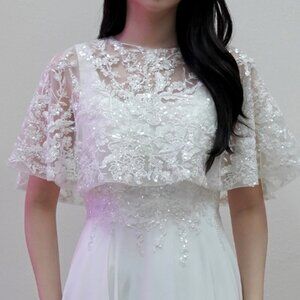 An enchanting A-line gown that captures timeless elegance. The square neckline and ruched skirt create a refined, feminine contour, while shimmering sequins lend a subtle radiance. Paired with a matching cape, this piece embodies modern grace with a hint of regal sophistication.