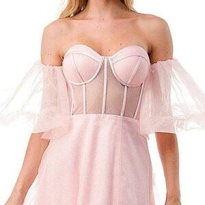 New A-Line Prom Gown w/Short Puff Sleeves & Glitter Sheer Boned Bodice TC L2793B