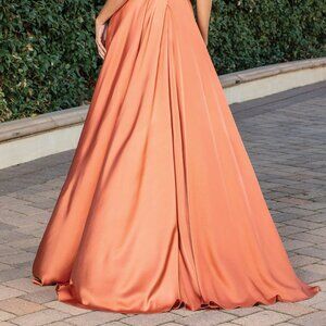 This long satin A-line gown radiates modern sophistication with its illusion plunging neckline and sleek, flowing silhouette. The soft satin fabric drapes beautifully, complemented by a daring leg slit that adds a touch of allure. Perfect for formal evenings, galas, or any occasion that calls for timeless elegance.