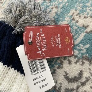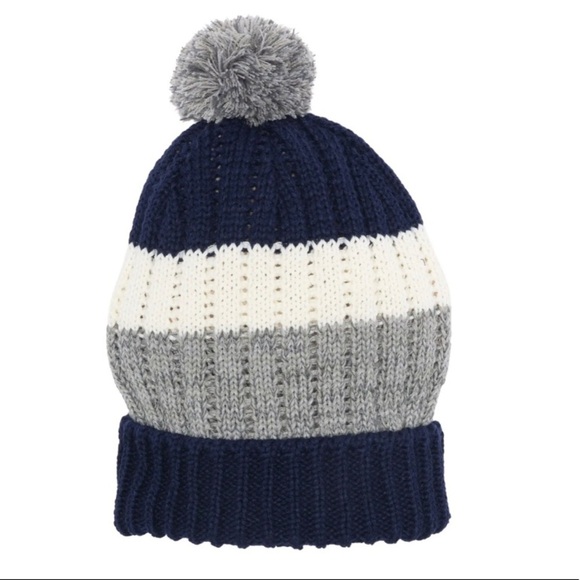 New AMERICAN NEEDLE Slope Knit Stripe Pompom Beanie In Navy-ivory-heather grey. New with tags. A chic stripe patterned knit beanie with a classic pompom detail is perfect for finishing off your winter outfits. Cuffed hem. Pompom detail. Stripe print. Knit construction.