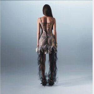 100% polyester. Made in Indonesia. Hand wash. Unlined. Hidden side zipper closure with back tie. Tie up accent at bodice with heart accent. Garment is intentionally sheer, undergarments will show through..Please note undergarment not included. Revolve Style No. AMIA-WD9. Manufacturer Style No. HEARTDRESS.