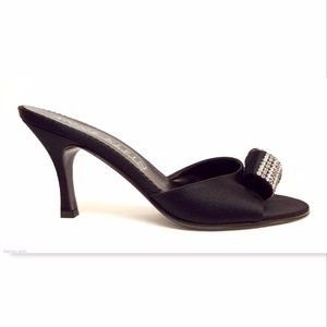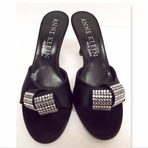 New ANNE KLEIN Crystal Embellished Knot Black Slide Heels Sandals from Italy 6.5