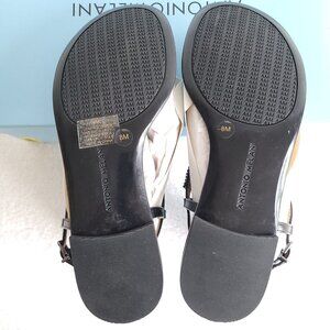 New ANTONIO MELANI black leather sandals with ornate black chain detailing, in style called "Bahlie". Wound together chain detailing cover this entire sandal. They are crafted into circular, oval, and banded shapes. Really make these unique and dressy sandals. The shine of the chains almost seem like black rhinestone detailing. 2 leather adjustable straps around ankle. These are truly amazing!! New never worn, still with box.
