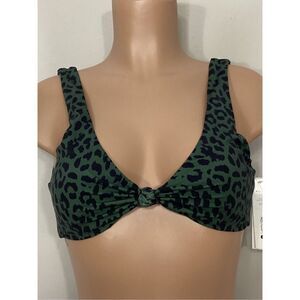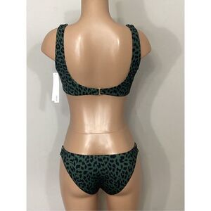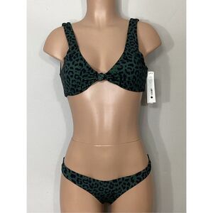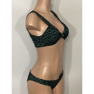 New. AQUA green leopard print bikini. Beautiful high-quality fabric in a green leopard print. This is mixed sizing. M-top/S-bottom. I have to pick a size 2 list so I picked a small. The lining is butter, silky, soft. The top has soft, removable pads over the shoulder styling with a three adjustment size clasp in the back. The bottoms are pull on cheeky style.