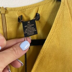 “Miss Grey “ V neck . Leather , suede mini dress . Beautiful mustard yellow color . Very soft and rich material , NWT. Size M. Measures approx 38” bust and 28” long ( under arm to hem). Back zipper hidden . Sleeveless
