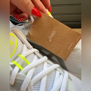 Stylish Asics athletic shoes. White mesh with neon yellow accents. Comfortable and durable design.