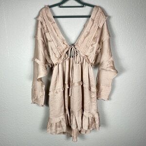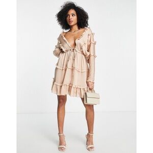 New ASOS Design Tiered Soft Mini Dress Pleated Tie Front Open Back Blush Sz 4