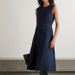 The classic fit-and-flare dress, reimagined in denim. Expertly tailored from premium stretch cotton, the sleeveless Karrigan dress features a lean bodice and a circle skirt. Darts and seaming along the waist further cinch the waist. Effortlessly refined, this denim midi dress is great for the day and can easily be dressed up for a night out. Retails $548.