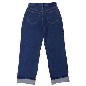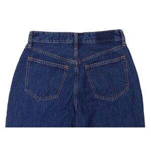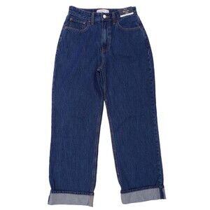 These jeans feature a solid blue color, a high rise waist with a zip and button closure, and a cotton blend denim fabric wash. The jeans have a straight style with a 5-pocket design and are machine washable. Perfect for all seasons, these jeans are a stylish choice for any occasion. Waist 27"/ Inseam 27.5" Retail $100