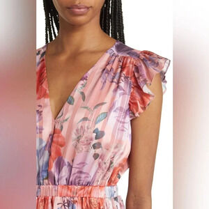 This full-of-romance midi is designed in enchanting blooms with fluttering cap sleeves and soft pleats.