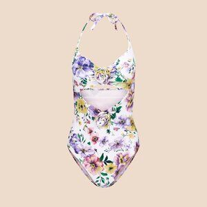 This one-piece swimsuit is perfect for a beach day. It has removable pads, a flattering keyhole cut-out under the bust, 3D flower details, and self-tie halter neck straps to provide support.