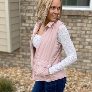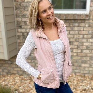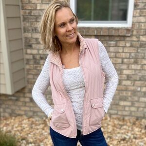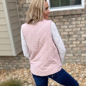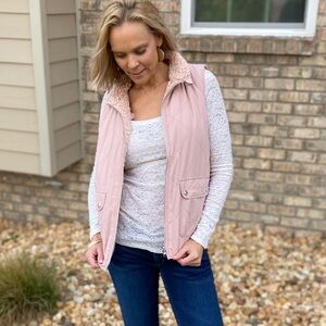 Pale rose pink quilted/shearling vest is reversible! Features snap pockets and is full zip. Choose the quilted woven side or flip to the soft shearling for a cozy look. Fits true to size. S(0-4), M(6-10), L(12-16).