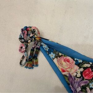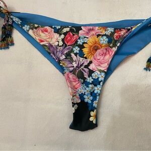 Vibrant floral bikini bottom. Features tie sides with tassels. Perfect for a stylish beach day.