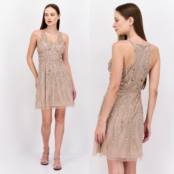New! Aidan Mattox Taupe Sequin Halter V-neck Mini Dress Size 2 - 26760
