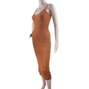 New Air Space Women Brown Rib Knit Spaghetti Strap V-Neck Bodycon Midi Dress M