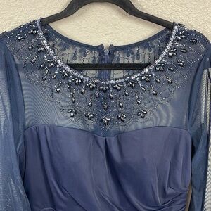 This fabulous full length gown is perfect for Mother-of-the-Brides! Beautifully beaded illusion neckline & sleeves adorn this flattering A-line silhouette. This style is a must-have!
