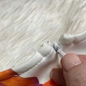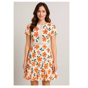 New without tags Alexia Admor A-line mini dress in white with vibrant orange floral print. Features vertical and horizontal lace trim down the bodice and across the waist; a ruffle hem. Flattering defined waist adds soft structure. Fully lined with hidden back zip—perfect for brunches, special occasions, spring events, or wedding guests.