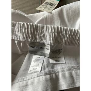 New with tags white cropped pants by Alfred Dunner // stretchy, short slits on the slides // small pale stain on the back leg of these pants // Please see photos for details, measurements, and any minor imperfections // All items come from a smoke-free home and are sold as-is // We strive to use re-used, recycled, and biodegradable shipping supplies whenever possible