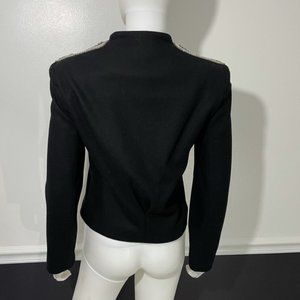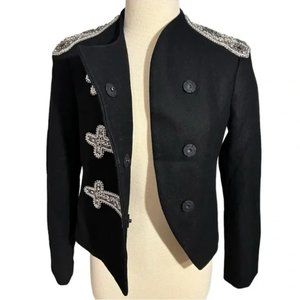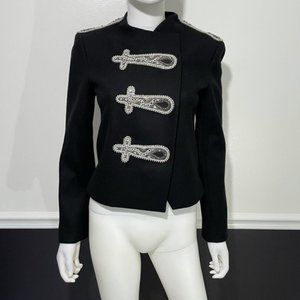 Brand new, never worn, no tags. Alice + Olivia Sergeant Pepper embellished military jacket. This is also called the "shrunken military" blazer jacket. This wool military jacket features crystals, pearls, beads, and chains at the front and shoulders. High collar. Cropped silhouette. Beaded and embroidered silver embellishments. Inverted back pleat. Hidden off-center asymmetric 3-snap closure. Wool blend. Long sleeves. Fully Lined. Celebrity and blogger favorite, as seen on Candice Swanepoel, Carrie Underwood, Elisabeth Hasselbeck, Estella Warren, Levin Rambin, Nicky Hilton. Size S. G7.