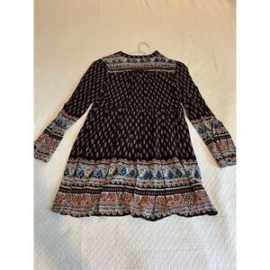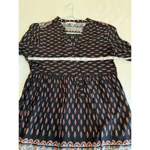 Excellent condition. Long sleeve button front v-neck dress. Black with red boho dress. Size M. Approx measurements across chest 16” waist 15” length 34”
