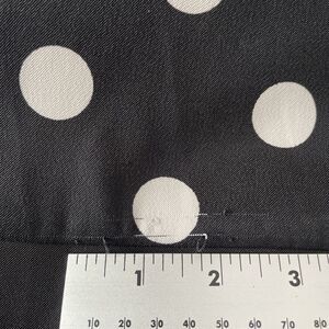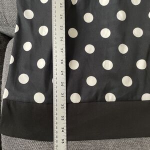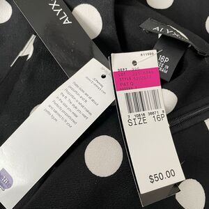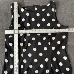 This is a new Alyx petite dress in size 16P. It is a knee-length black dress with white polka dots, featuring a sleeveless design and a round neckline. The dress has a retro theme and is suitable for parties or cocktail events. It has a shift style, a zip closure, and is made of polyester material. The garment is machine washable and is branded by Alyx.