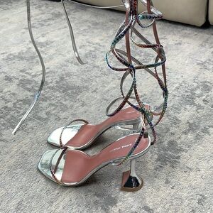Amina Muaddi x AWGE "LSD" gladiator sandals in mirror leather with rainbow crystal-embellishements. Wraparound self-tie straps circle up the legs. 3.7" covered pedestal heel.