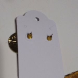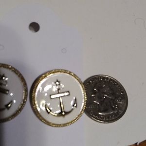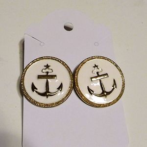 New from jewelry store closing sale. This button style pierced white and gold earring has a gold anchor on a white background. It is about the size of a quarter.