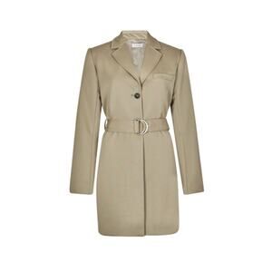 It's cut for a crisp, blazer-inspired fit that can be adjusted by its removable D-ring belt for feminine shape and structure.