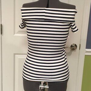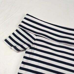 Ann Taylor LOFT blue and white striped off the shoulder top. Soft, ribbed and stretchy for body hugging fit. Made of 96% cotton, 4% spandex. Machine wash and dry. Store tags were removed but item has never been worn.