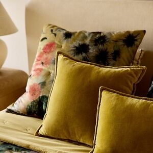New without tags. Anthropologie Colliere Velvet Floral Euro Shams. Set of 2. Gorgeous rich saturated velvety colors of gold, coral, green and purple. Sold out online. Pillow inserts sold separately. Envelope closure. 100% polyester; 100% cotton backing. Machine wash. 26" square. Retails for $70 each cover. Excellent clean new without tag condition.