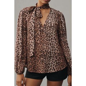 The RIXO Moss Silk Top, crafted from lightweight silk crepe de chine, features a classic V-neck, long sleeves with elasticated cuffs, and a loose, floaty silhouette designed for tucking and effortless styling.