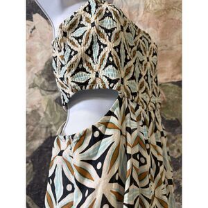 Patterned jumpsuit in wide leg silhouette w/ cutouts and smocking at the top