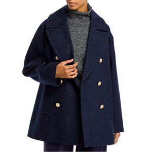 Bloomingdale's Aqua brand peacoat featuring a notched collar, double-breasted gold-toned buttons, welt pockets, drop-shoulders, a fully-lined interior, and mid to heavyweight twill wool blend fabric in navy blue.