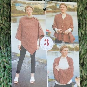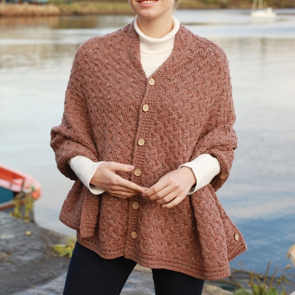 Knit in an Irish woolen mill, this authentic Aran items can be worn 3 ways: Cape (poncho), Shrug, Cardigan (Wrap)