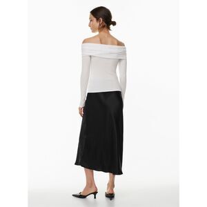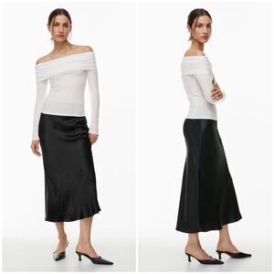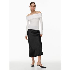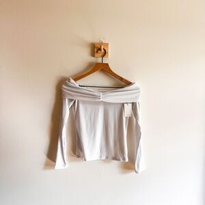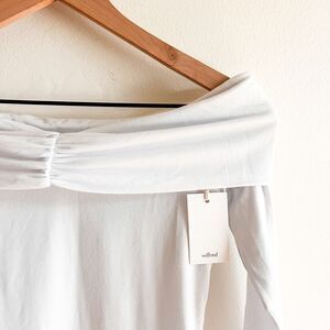 Aritzia Wilfred Streamline Top in White. This is an off-the-shoulder longsleeve designed for a tight fit. It’s made with GoodLux — luxuriously soft, drapey fabric made with TENCEL™ Lyocell — responsibly sourced wood-based fibres produced through a closed-loop system that reduces environmental impact. Brand new with tags. No holes, rips, or stains. Ours is a smoke free home.