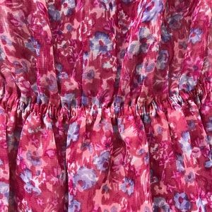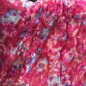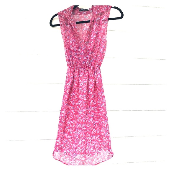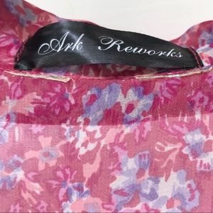 Sweet sleeveless pink floral dress. New rendition of a vintage dress. Ark Reworks takes vintage dresses and reshapes and sews then into whole new creations. Collar and button front v neck. Great detailing. Elastic waist and slightly sheer poly material with lined skirt. Best fit for a Small.
