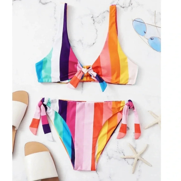 Rainbow striped front tie bikini set. Available in small, medium and large.