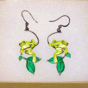 New Artisan Signed Sterling Silver Handcrafted Frog on Vine Drop Earrings