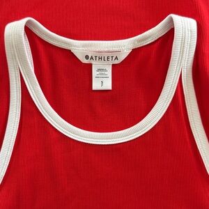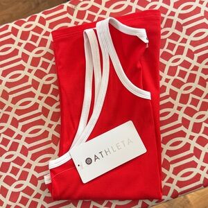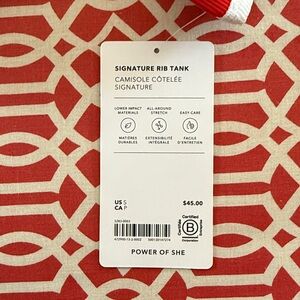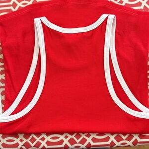 Never been worn with tags. These tanks are forgiving with just the right amount of stretch! White piping on neck and sleeves is bright and fresh. Just the right length for tucking or not. Wear alone or layer it!
