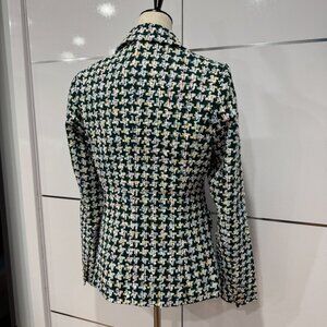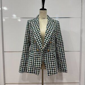Make a lasting impression with this stunning houndstooth tweed blazer, featuring a peak lapel and padded shoulders that exudes
