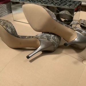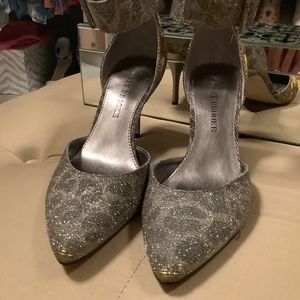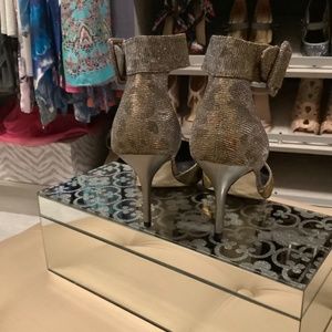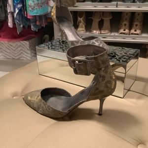 Subtle shimmer animal print ankle button close pump. Colors reflect taupe, grey, bronze, silver and gold. Soft and subtle and very versatile