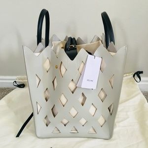 Pale grey cutout calfskin Celine medium luggage phantom tote with gold tone hardware, black leather trim, dual rolled top handles, debased logo at front, single exterior zip pocket, protective feet at base, creme canvas interior, single interior zip pocket, and pull-through closure at top.