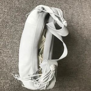 Top handle - Top zip closure - Exterior features leather construction with tassel applique details - Interior features 1 wall zip and 2 wall slip pockets - Dust bag included - Approx. 10" H x 17" W x 3" D - Approx. 15" handle drop - Imported
