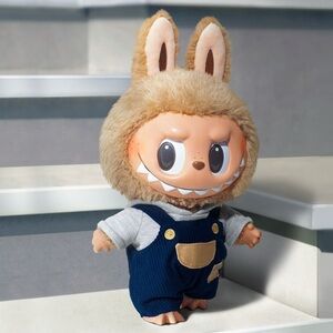 Adorable plush doll with bunny ears. Features blue overalls and a furry hood.